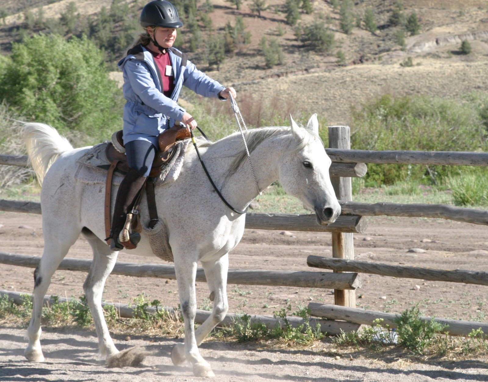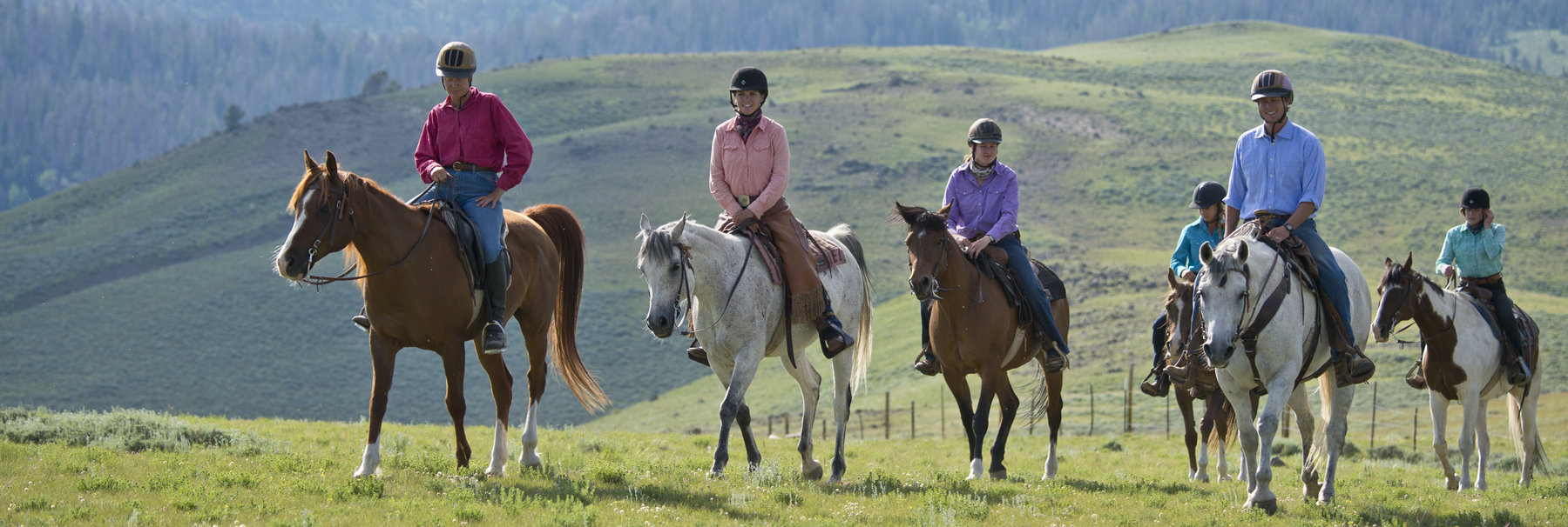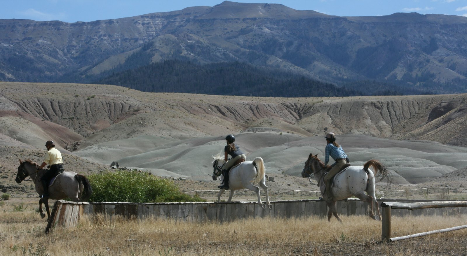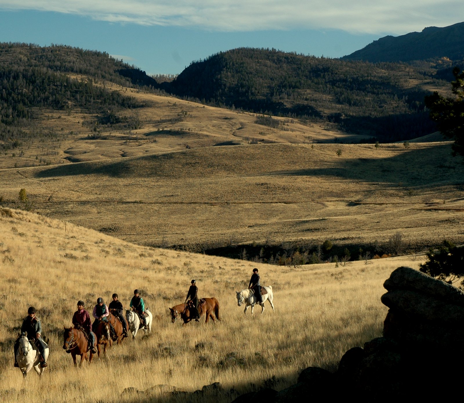 Le Wyoming fait presque la moitié de la superficie de la France avec 500,000 habitants. Donc nous avons des espaces énormes pour monter à cheval et le terrain est très varié. Nous montons dans les montagnes, les forêts et les hautes plaines et nous pouvons aller dans n’importe quelle direction car les voisins les plus proches sont à 6 kms. au sud et au nord à 80 kms. L’endroit est idéal pour les vacances à cheval et c’est un grand plaisir de découvrir ce pays magnifique avec la complicité d’un bon cheval. Il y a des destinations intéressantes comme une ancienne cachette de Butch Cassidy. Nous avons assez de chevaux pour nous permettre de changer les montures souvent pour qu’ils puissent rester en bonne forme pendant toute la saison sans être trop fatigués. Nous sommes très fiers de nos chevaux et beaucoup d’entre eux sont nés et dressés sur notre ranch. Nous avons plusieurs instructeurs équestres diplômés qui offrent des leçons gratuites deux fois par semaine. Les premiers groupes vont plus vite et font des bons galops et les débutants font des ballades plus lentement sur des chevaux plus tranquilles