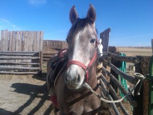 Whether you use ropes or calf tables, branding day is a long day, so we get an early start. Here Whistle is, greeting Bob first thing in the morning. She, for one, is wide awake and excited for the day, despite the early hour!