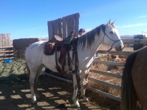 To accomplish Task One, Richard, Jim and I planned to ride horses to herd the cows in, while Bob would lure them into the corral with the hay truck, scattering hay in the pen. Since I already had horses in the corrals to teach them neck reining, Richard and I decided to ride two of them for the sake of convenience. Richard and I waffled over whether to use my neck reining horses. Generally, the horses I work with are not the most experienced with cows, and herding the pairs in for branding day is a rather intense experience– lots of cows moving quickly in a relatively small space. Even seasoned cow horses can get over-excited in such a situation. In the end, Richard and I decided to roll the dice and see how Alicante and Isabella handled the situation. I rode Alicante, an Arabian-Thoroughbred-Andalusian cross who was bred at the ranch. Has there ever been a cuter face? He has NO idea that he is about to be in the middle of hundreds of bawling animals: