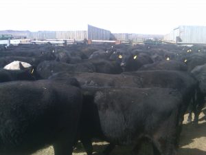 Jim and Richard cantered off after the calf, which left Alicante and me in a predicament. Alicante did not like being abandoned by his horse friends at top speed and began prancing in place, whinnying loudly. Fumbling, I shoved my camera phone into my pocket, trying to get ready for the tantrum Alicante was on the verge of throwing. When I finally looked up, my eyes went as wide as saucers: the entire herd of cows was leaving the corral at a gallop, heading straight for Alicante and me. The sprinting calf had excited them, and they had decided they were going back to pasture at a fast clip. Alicante and I were the only things in their way, as Richard and Jim were still chasing the rogue calf. Alicante’s patience was growing thin– every muscle in his body was tensed, I could see the whites of his eyes, he started nickering nervously. He was trying so hard to be a good boy! I could almost hear him saying, “Lady, do you really think we are going to stop this herd of galloping cattle all by ourselves? Can we please get out of here now?” Ultimately, I agreed with Alicante– there was no way we were stopping those cows alone! So, what did we do? We turned around and ran down the hill ahead of the cows. It would have made a funny aerial view: 200 sprinting Angus cows chasing a lone horse and rider down a hill– reverse herding! Eventually Richard, Jim and I regrouped, and our second attempt at herding the pairs into the corral actually did go smoothly. I left my camera in my pocket for Round 2, just in case:).