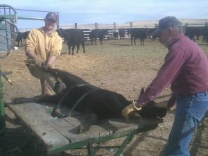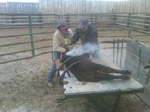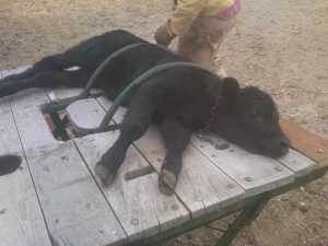 Now the calf is ready to get its vaccines and brand. This is the position in which Richard and I hold the calf in preparation for Bob to brand it: