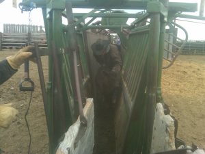 After branding the last calf, we moved on to Task 4: processing cows. Each cow needed her yearly vaccinations, in the form of shots, and a squirt of Ivomec on her back to de-worm her. It was identical to processing heifers, except for the fact that the cows know the exactly what is going on, so they march down the chute like champs without any encouragement from us. As a result, despite the fact we had four times more cows than we did heifers, we processed them in the same amount of time! Gotta love those smart, seasoned cows!