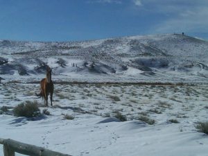 For the rest of the summer and fall, Freedom would come and go from the fence line. There were plenty of native grasses for her to eat on the BLM land, and we could see her tracks to and from the river, where she would water each day. Sometimes we would not see her for days, but we would still see her tracks, and she always returned. When autumn turned to winter, Freedom explored less and less. Worried about her pawing through snow to eat grass, Mel started throwing her hay each morning after feeding our herd of horses. Freedom now knows the routine and waits each day for her ration. After you hay her, you can lean on the fence, not 5 feet from where the hay is, and she will come and eat it. She is certainly not tame, but she understands that people are providing her food this winter.