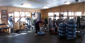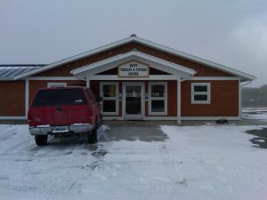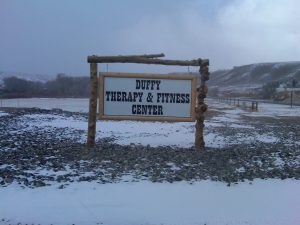 Now that you are armed with your categorized list, full tank of gas and old dog, you are ready to go to town. Isn’t this fun?! The centerpiece of today’s trip to Dubois was my first physical therapy appointment with Margi (pronounced Mar-ghee… a hard G like the G in “go”… elucidating pronunciation is hard!), held at the somewhat new Duffy Therapy and Fitness center, located next to the Dubois Medical Clinic on US Highway 26. It was my first time in the establishment, and it is shockingly well-equipped. I did think it was a bit ironic that when I drove into the parking lot, two men were erecting a Pepsi-Cola vending machine right next to the front door of the health club. Anyone else see the humor in that? Here is the fancy sign posted on the highway….the photograph is grey because today was just that, grey and snowy: