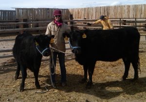 I must say that Phase 2, the actual processing of the heifers, went much more smoothly than Phase 1. We were all immensely relieved, as usually when Phase 1 is difficult, Phase 2 is a nightmare! Sapphire was among the heifers we vaccinated, but we saved her for last. Rather than herding her, we haltered her and led her up the chute. I must admit that she was, by far, the most dramatic of all of the heifers…the way she wailed when she got her shots! It took a lot of petting to earn her forgiveness. We then gathered the whole family together for some post-processing photographs. Here I am with my girls, Garnet and Sapphire– the cutest cows on the planet, I am convinced: