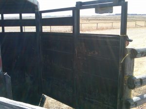 There is a reason that I only have photographs of the fourth group of very orderly angel-heifers strolling onto the trailer politely. The other three groups were monster-heifers, and I think Bob and Richard might have killed me if I had taken photographic evidence of their plight (there was a lot of screaming, arm-waving and maniacal running by humans and bovines alike). It took us 45 minutes to get the first group of heifers on the trailer, and they escaped TWICE. You would think we would have solved the problem after the first break out, but not so. We attach the trailer door to a post to keep it open while the heifers are loading, like so: