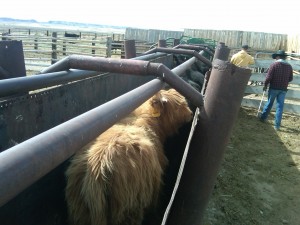 First Question: What is a heifer? A heifer is a young female cow that has not yet given birth to her first calf. After the heifer has her first baby, she becomes a cow. So, the heifers we were dealing with today are one year old, and they will be bred to a bull in the middle of April for the first time. They will have their first babies when they are two, which is pretty standard for Angus cattle. We also dealt with 3 Scottish Highland heifers today. They are all two years old, will be bred this spring and will have their first calves when they are three years old. Scottish Highlands develop more slowly than Angus, which is why we wait an extra year to breed them.
