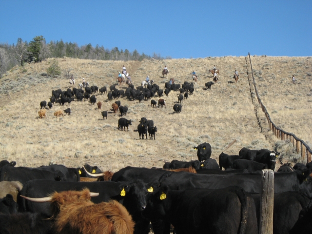Winter arrived all of a sudden last week after a long, glorious Indian summer, which was much appreciated by participants in the cattle roundup. We had quite an international crew (Australia, England, Scotland and France) as well as our core of trusty cowhands who keep coming back. The wolves made the gather more difficult by chasing all the cows onto the Indian Reservation, but in the end we were missing just one cow and four calves, who were probably killed.