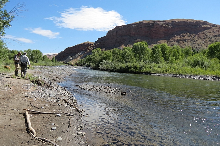 On route 26 just below Dubois the Wind River passes beneath the sheer red cliffs of the Painted Hills and there are several public parking places with access to stretches of the river. Fishermen are allowed to move close to the river, but it can be difficult to move up and down stream without crossing private land. The Wind River has a strong current and is difficult to wade across in most places. The character of the stream with huge boulders, rapids and deep pools below the picturesque red cliffs is overwhelming.
